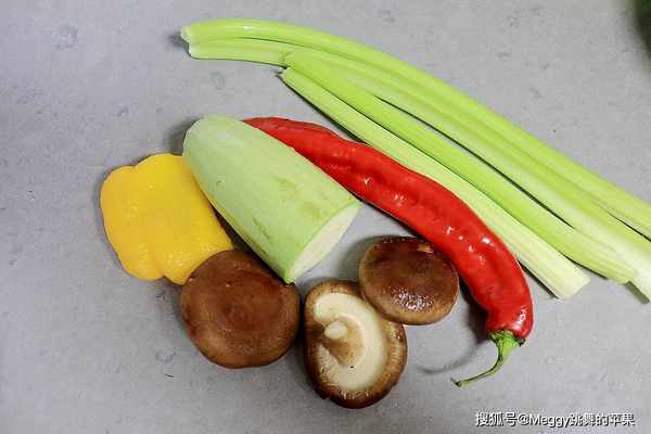 【主料】 芹菜半棵,西葫芦半个,鲜香菇3朵,红辣椒1个,黄甜椒半个