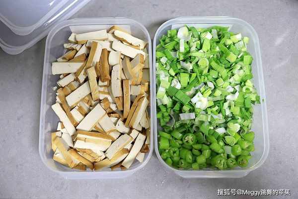 2. 豆腐干切条;青蒜切末,杭椒切圈;