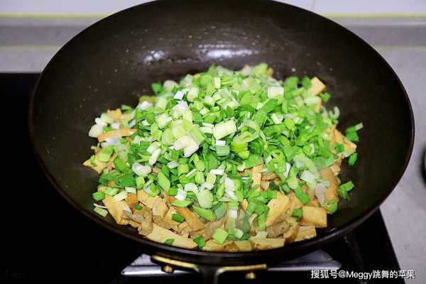 6. 待豆腐干略变坚实,倒酱油、生抽,撒盐,翻炒入味;起锅前倒青蒜末,略微翻炒,出锅。