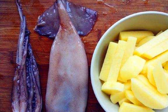 买好全部的材料,鱿鱼洗好,放着等下用,土豆去皮,切成条(块状),用保鲜膜把土豆包好,放到微波炉,微4-5分钟。