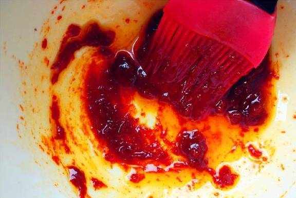 油,韩式辣椒和孜然粉加在一起(没有韩式辣酱,用其他辣椒酱代替也可以)调好。抹在鱿鱼外部,均匀。