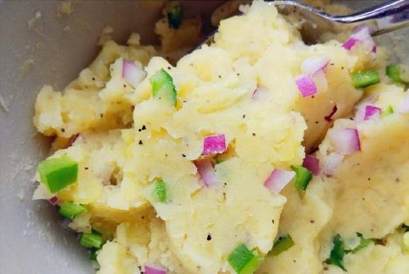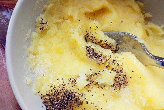 把土豆压成泥,加一勺盐和黑胡椒粉,搅拌均匀。