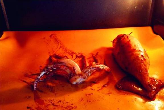记得用牙签把口封住,烤箱需要预热,放进去,调好上下火180度烤上8分钟左右。拿出来在涂辣椒酱。,继续烤上4分钟(如果鱿鱼厚就多烤一会儿)