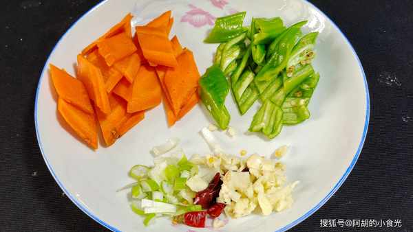 第二步:准备配菜胡萝卜半根,去皮后切成菱形片备用,青椒剖开去籽也切成菱形片备用,再简单的切一点葱蒜和干辣椒备用。
