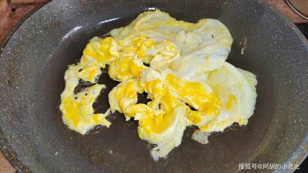 第三步:三个鸡蛋打散后倒入油锅中炒熟炒炒出干香味,盛出控油备用。