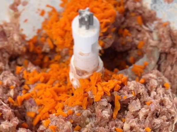 2、搅打成肉馅之后加入胡萝卜碎,再搅打一下,让胡萝卜与牛肉馅完全混合。
