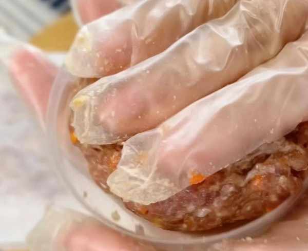 3、接着取适量的肉馅揉成团,找一个塑料罐的盖子,将肉馅放进去按扁。