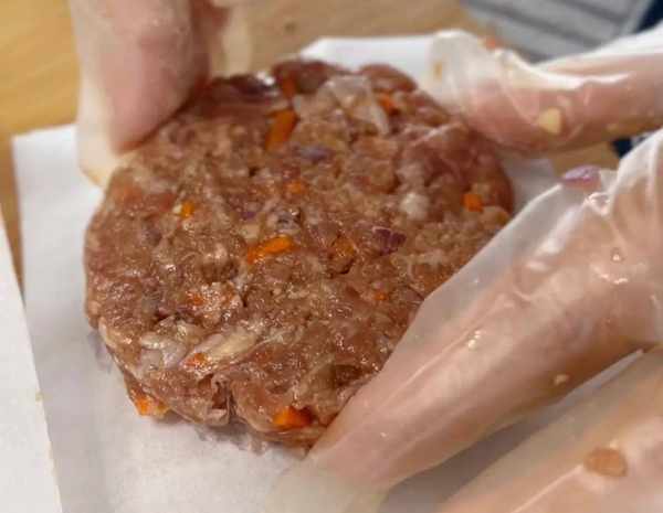 4、将盖子倒扣在手掌上,这样一个圆形的牛肉饼就制作好了。每个牛肉饼之间用油纸隔开,放入冰箱冷冻保存,随吃随取,非常方便。