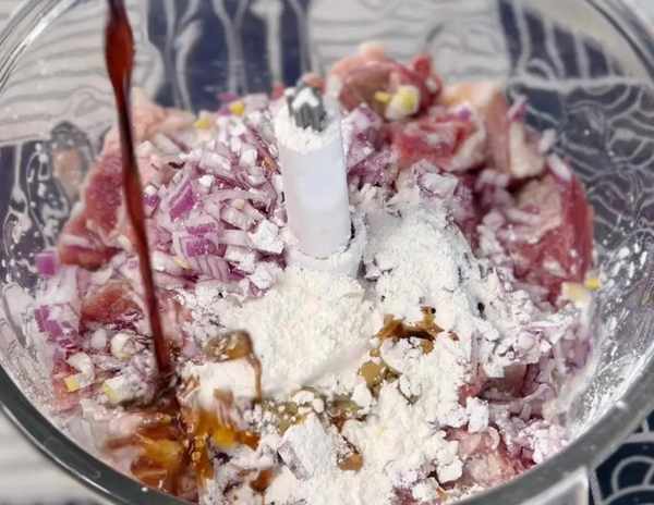 1、将牛肉切成小块放入绞肉机中,加入洋葱碎、蛋清、玉米淀粉、生抽、盐、味精等,搅打成肉馅。我用的牛肉没有将肥肉剔除掉,如果喜欢吃纯瘦肉的话可以直接用瘦肉。
