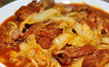 4、炒锅烧热放油,放入排骨、姜、黄酒(约1汤碗)、陈醋(约2汤碗)翻炒均匀,加水至排骨高度上盖烧开,转中火烧20分钟左右,放入白菜、番茄酱(约2汤匙)继续烧10分钟左右,放适量盐、白醋(约1汤匙)、糖(约2汤匙)、淀粉勾芡收汁即可。
