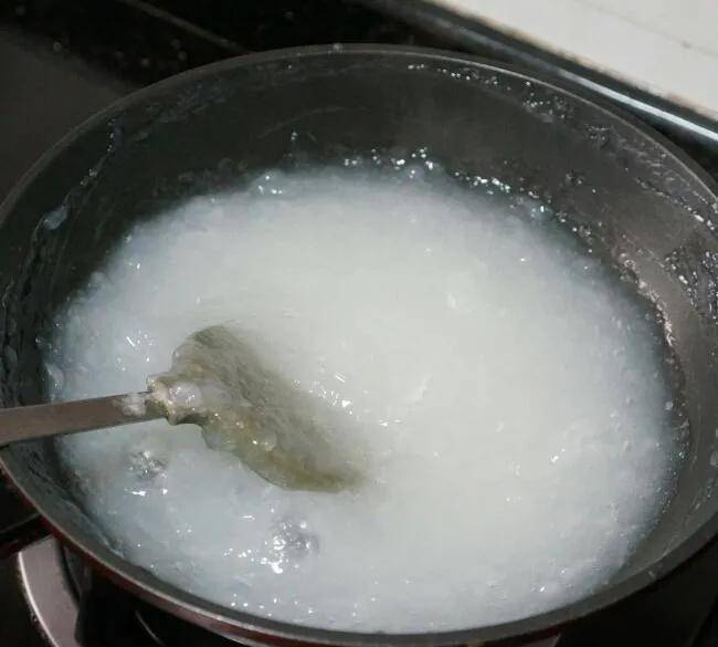 步骤一:锅里倒入900克水,把豌豆粉也倒入锅里,开小火一直搅拌,不要停,不然豌豆粉会沉底