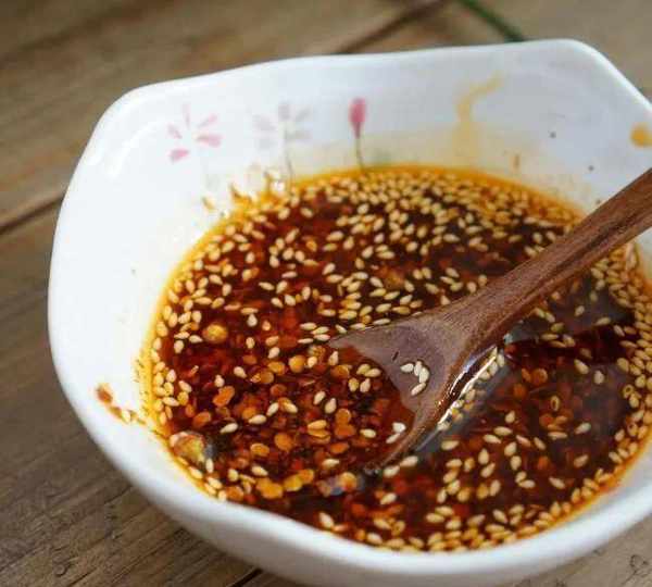 步骤三:调个酱汁:先烧热菜籽油烧热后的油放入无水的碗中,稍微晾凉一分钟辣椒面分三次加入分次加入会令辣椒味儿更香,最后撒入适量炒香的白芝麻,然后再在这个基础上加入酱油、陈醋、糖