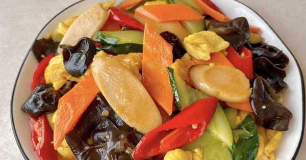 木耳泡10个、鸡蛋2个、胡萝卜半个、黄瓜半个、红辣椒2个、火腿肠1根、葱半根蒜4瓣、蚝油、盐、糖