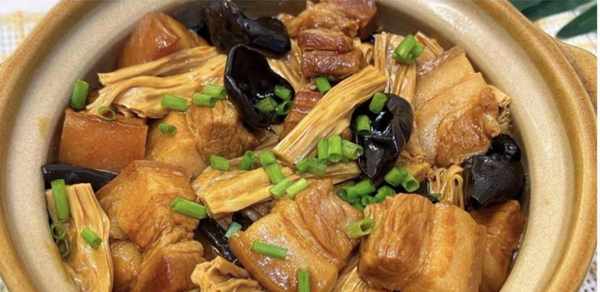 3、加两碗清水小火焖煮三十分钟左右,放腐竹和木耳焖熟,撒上葱花