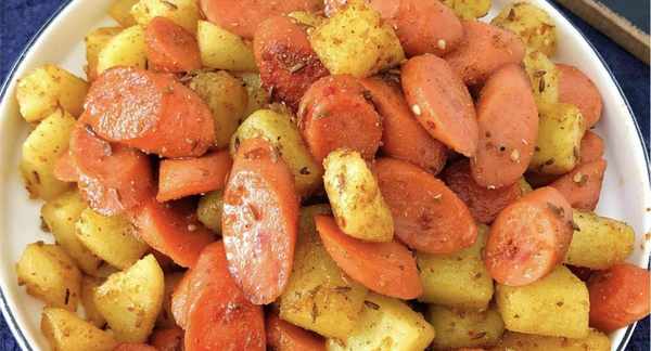 土豆3个,火腿肠4根,孜然烧烤料,蚝油1勺,生抽1勺,葱花少许。