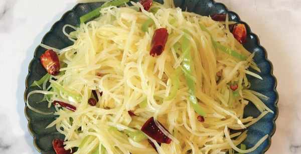 1、土豆去皮洗净切丝,切好的土豆丝冷水浸泡半小时(这步很新的如果不浸泡土豆丝去除多余淀粉炒出来的土豆丝会很粘)浸泡半小时取出土豆丝沥干水分备用,土豆丝捞出两分钟内尽量入锅炒,放久了会变色的