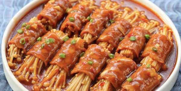 金针菇1把、培根卷8块、大蒜2瓣、豆瓣酱半勺、1勺淀粉