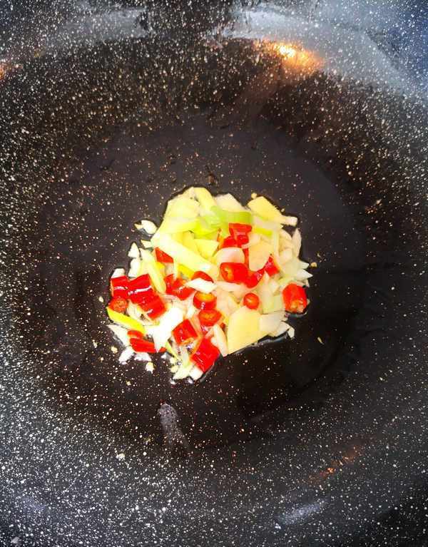 锅里倒入适量的油,油热后倒入葱、姜、蒜、辣椒圈小火炒出香味。