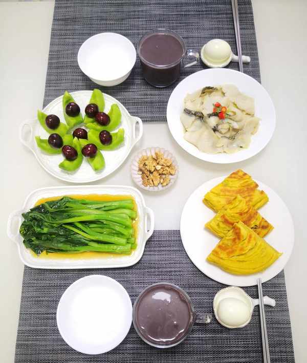 今天我们家的早餐主食有杂粮发面饼,外焦里软,发面好消化;今天的肉是低脂肪、高蛋白的鱼肉,采用炒的加工方式,既滑美鲜美又简单快速,一份白灼蔬菜,清淡爽口,原汁原味,为身体补充多种矿物质,再来一杯五谷豆浆和水果,食材多样,营养很全面。