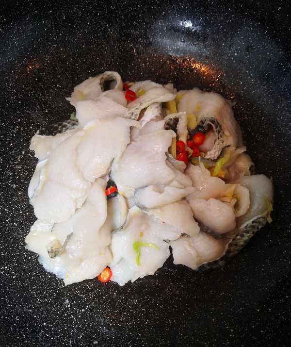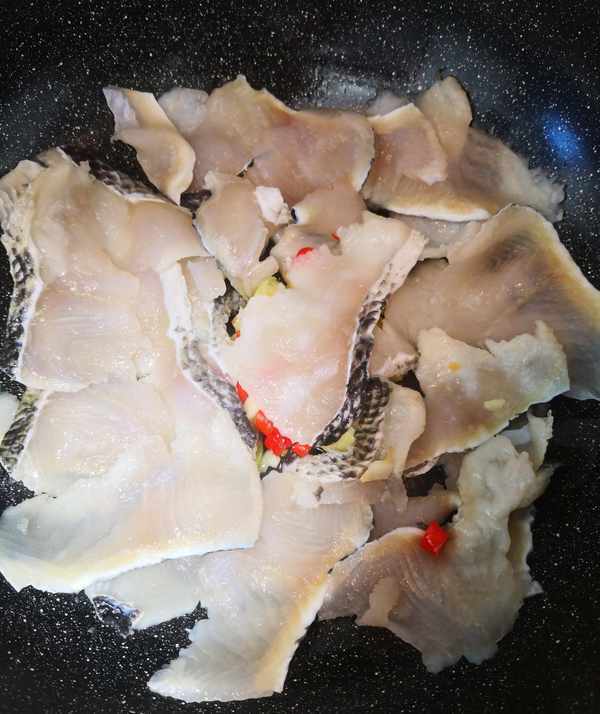 加热至鱼片差不多变色再用筷子翻动,使鱼片受热均匀,加少许生抽提鲜。