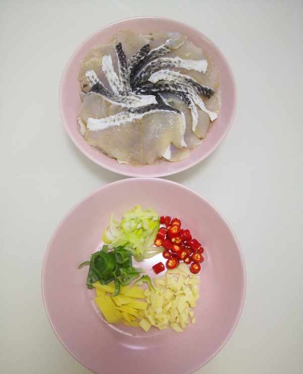 片好的黑鱼片少加点盐抓拌均匀静置10分钟再用清水冲洗干净,直到鱼肉不发黏,再沥干水分,接着在鱼肉里先加盐反复抓拌至上浆时,准备一个小碗,加点淀粉和水调成淀粉水,倒入少量的淀粉水反复抓到鱼片把淀粉水完全吸干,再倒入少量的淀粉水,重复四五次,最后把抓拌好的鱼肉放冰箱冷藏静置30分钟至1小时,可以提前一晚上做好放冰箱冷藏腌制一夜,节省早晨时间,再准备葱、蒜、姜、小米辣切好备用。