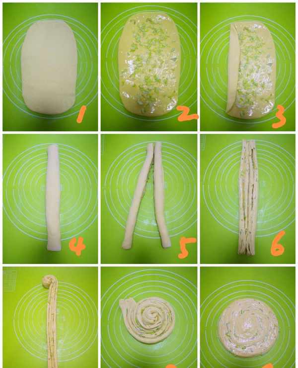 2.刷油酥—撒少许盐—撒葱花。