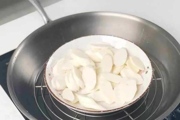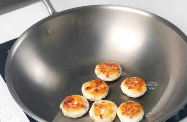 10、鹅妈妈钛晶锅中倒入适量植物油,放入山药饼小火慢煎;