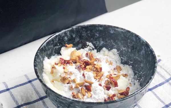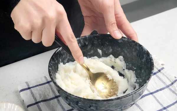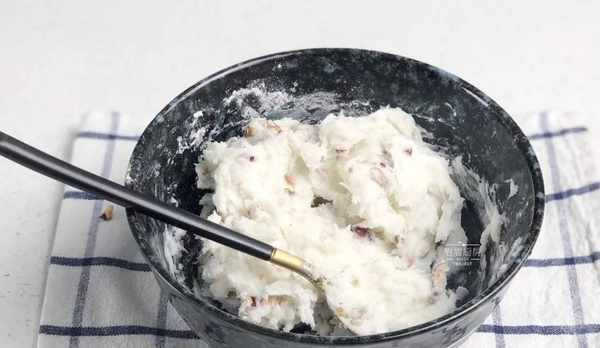 6、倒入10克白糖、20克牛奶、20克红枣碎、20克糯米粉;