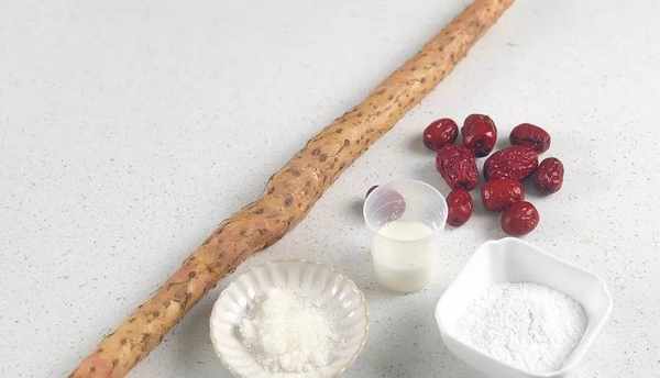 铁棍山药200克、10克白糖、20克牛奶、20克红枣碎、20克糯米粉