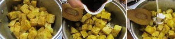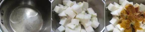 1、首先把锅烧热,倒少量油,白萝卜去皮切块下锅翻炒一下,然后把所有粉末状的调料全都倒入锅中;