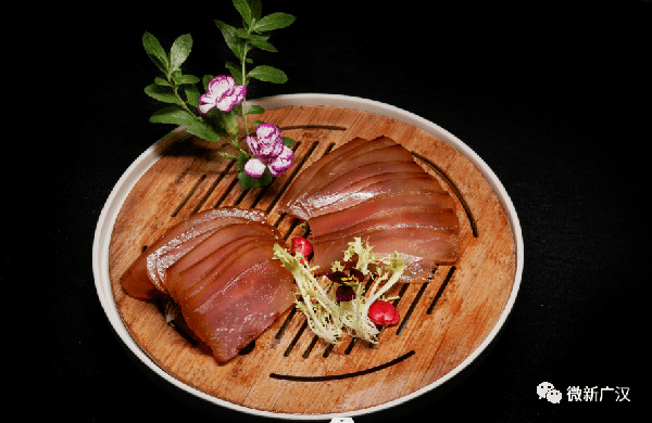 三星堆金面子——腌猪头主要选用纯黑猪,精心配选上等香料,装缸腌制而成。腌制后的猪头皮层金黄,内层肉质透而红亮,入盘好似金色之面,片如金薄,满口留香。