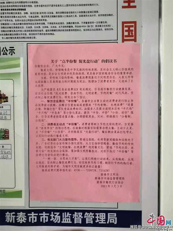 中国网文明中华讯 为有效制止餐饮浪费行为,引导全市餐饮行业健康发展,近日,新泰市市场监管局联合新泰市文明办、新泰市餐饮行业协会,共同开展反食品浪费专项行动。