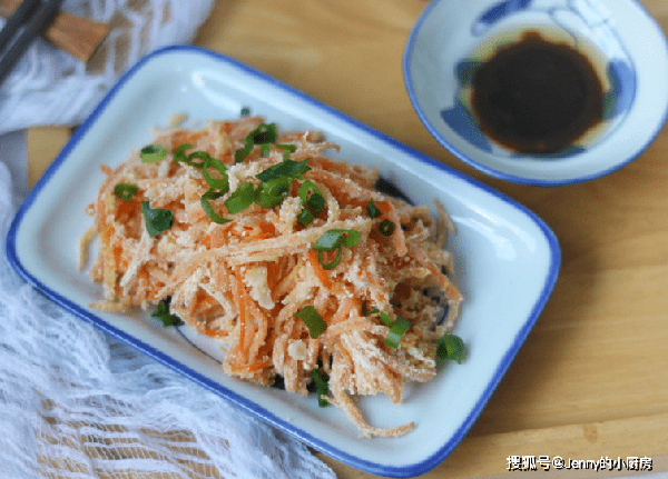 等胡萝卜丝蒸好后抖散,吃的时候蘸料,也可以直接浇上蘸料再吃。