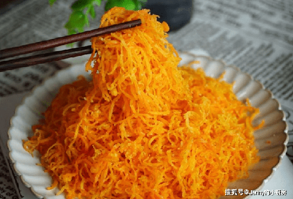 胡萝卜去皮洗净,擦成细丝。分次加入面粉搅拌,直到每根胡萝卜丝都裹上面粉为止。