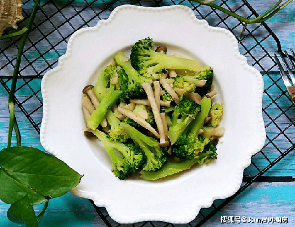 待蟹味菇变软后,倒入西蓝花翻炒均匀,再加少许盐翻炒片刻出锅。