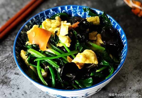 接着倒入菠菜、木耳翻炒均匀,再倒入鸡蛋翻炒均匀。