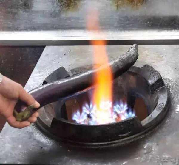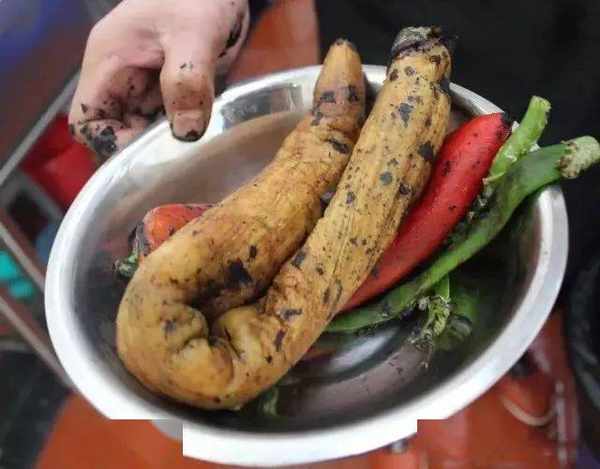 1、茄子、红牛角辣椒、青二荆条分别在炉火上烤至外皮焦黑、成熟。
