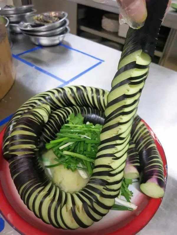 3、茄子先横向下刀片开。