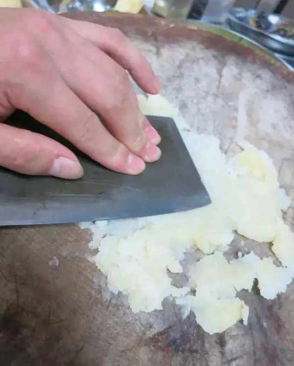 2、土豆300克去皮洗净,放入水中煮熟,取出置于砧板上,用刀面按压成土豆泥码入盘底。