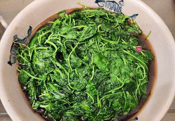 3、 草头炒熟后,绕着锅边淋入一小勺白酒,烹出酒香味就可以关火了。