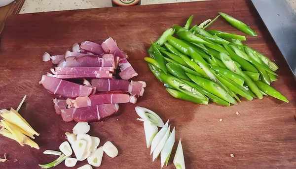 1、因为腊肉上有霉点,所以要先把霉点切掉,再把腊肉用温水和白酒洗干净,切成小片。切开以后就能看见,这块腊肉的里面还是非常漂亮的,没有变质,是可以食用的。青椒洗干净切成细丝,生姜切成细丝,大蒜切小片,葱切段。