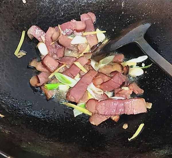 2、炒锅烧热后,加适量食用油,油热把姜丝、葱段、大蒜下锅,煸炒出香味后,倒入切好的腊肉,大火不停的翻炒。腊肉炒变色后,加入切好的青椒,撒适量的食盐、酱油、鸡精,翻炒均匀就可以出锅了。因为腊肉反复清洗过,所以食盐的用量要掌握好。
