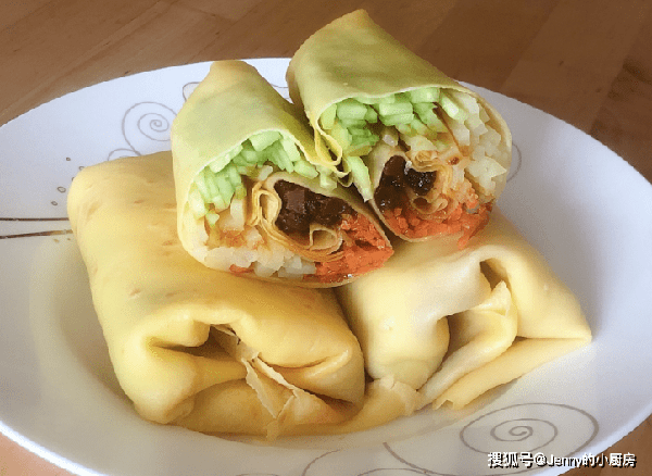 放好后卷起来,就可以食用了。喜欢吃肉的朋友,可以提前腌点里脊肉片或者鸡胸肉条,煎熟了放在卷饼里。