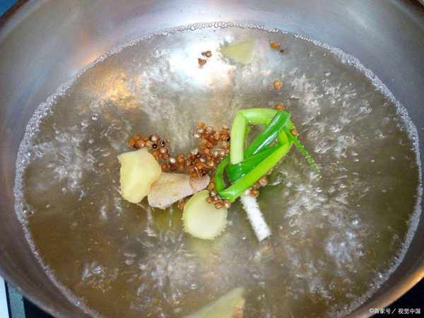 全部材料用水冲洗干净,同时把材料凉水下锅加适量高度白酒除腥;开了锅之后就会不停的撇去漂出来的泡沫,这也是腥味的由来,因此大家在焯烫的过程中要撇去泡沫。、
