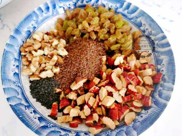 2、将红枣和葡萄干洗净,红枣切碎,核桃切碎,倒入碗中,再加入适量红糖和黑芝麻搅拌均匀。