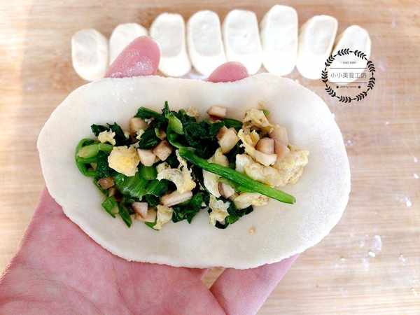 3、将发酵好的面团分成面剂,擀成面皮后包裹住馅料。