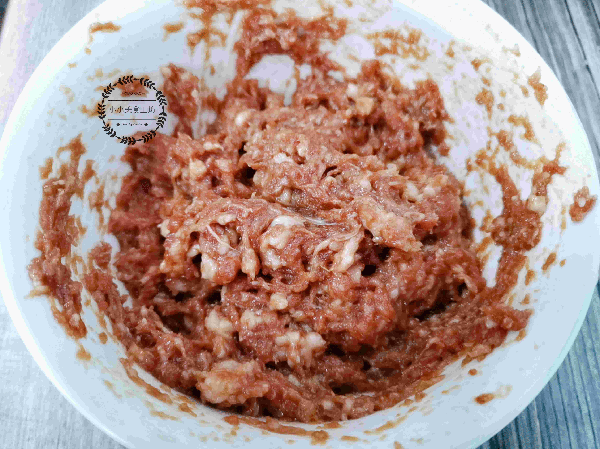 2、猪肉洗净剁成肉末,加入适量生抽,老抽,蚝油,五香粉和食盐,搅拌均匀。