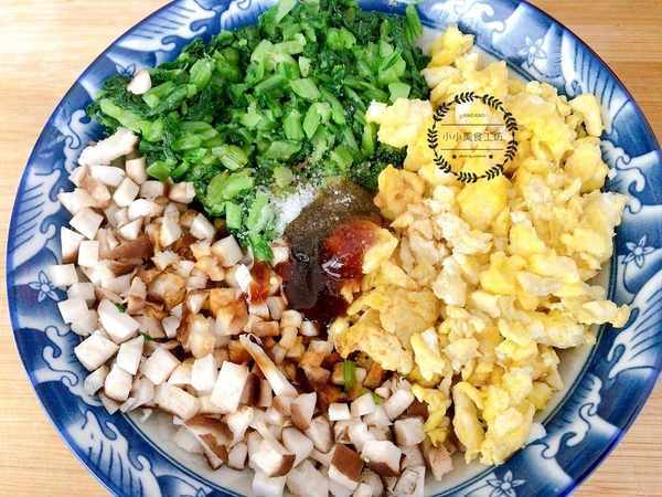 2、小白菜焯烫成熟后剁碎,与香菇丁,炒熟的鸡蛋碎放入盆中,加入适量生抽,蚝油,食盐和胡椒粉搅拌均匀。