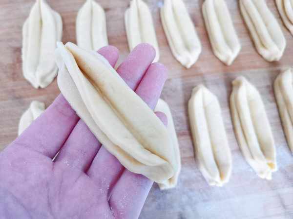 2、将发酵好的面团取出,擀成薄片,切成长条,然后将两张面片叠起来,中间用筷子压一下,然后从中间切开,切口的两头按压紧实。