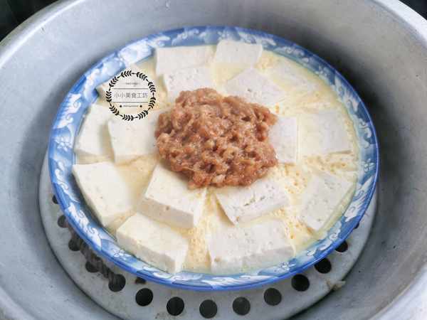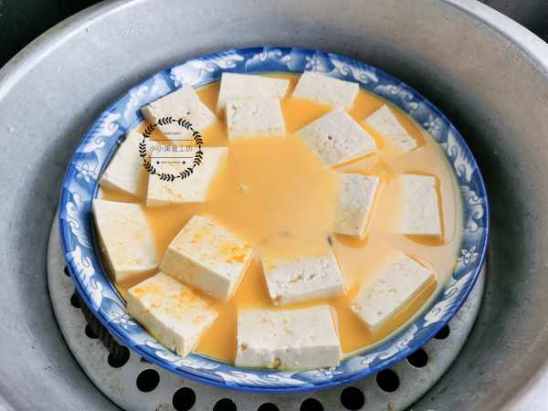 1、豆腐洗净后切块摆在盘子中,鸡蛋打散后加入少许清水拌匀,淋在豆腐上,接着放入蒸屉蒸制。
